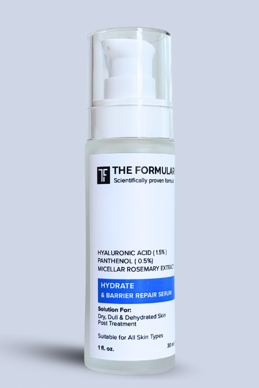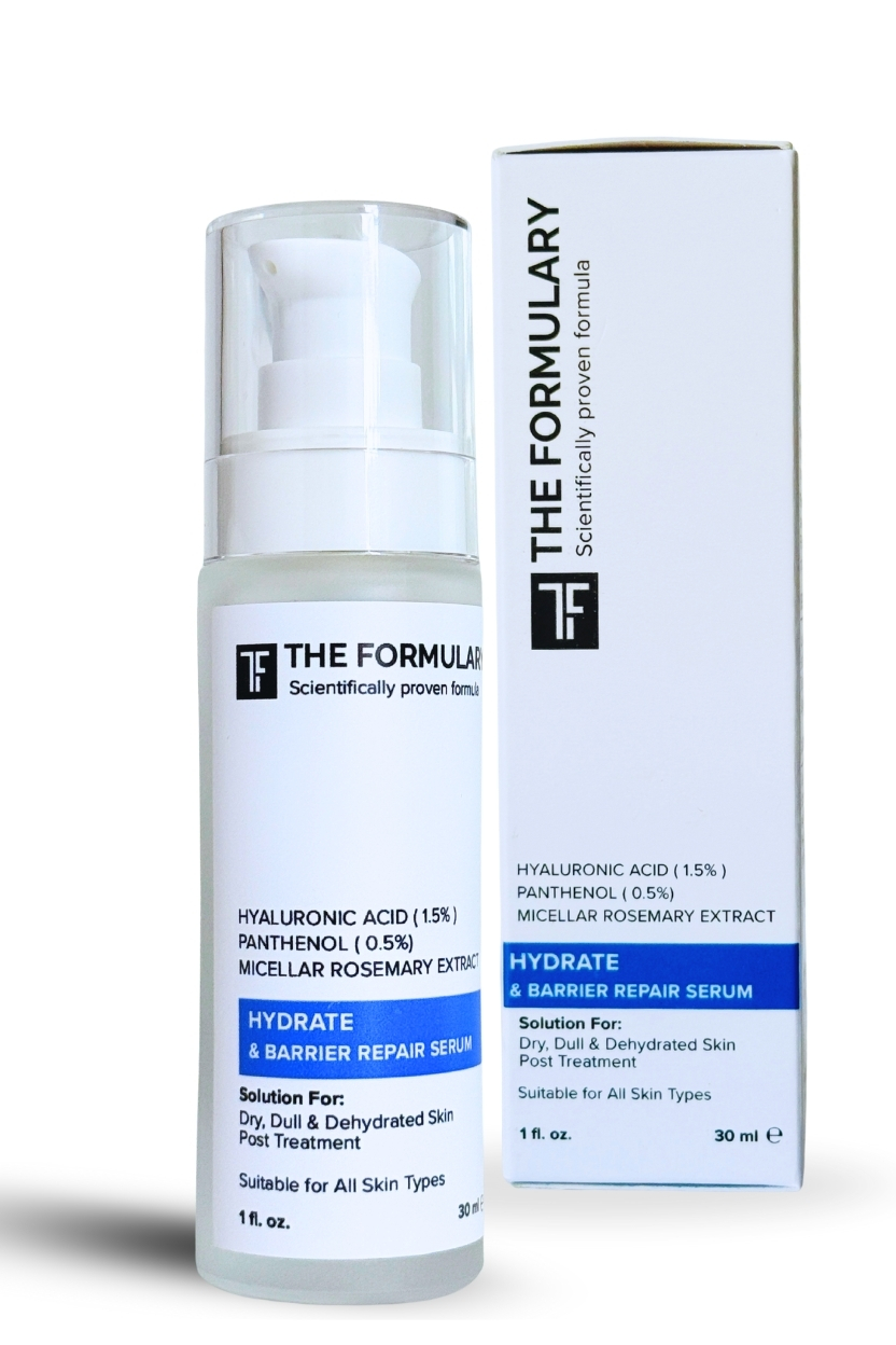 The Formulary Hydrate & Barrier Repair Serum delivers intensive hydration and skin barrier repair using cutting-edge micellar technology and clinically proven actives. At its core is Triluronic® Acid, a 3-molecular weight hyaluronic acid that penetrates deep into the skin to attract and hold moisture. Paired with Panthenol, Vitamin E, and Micellar Rosemary Extract, this formula calms irritation, strengthens skin barrier, and restores glow.