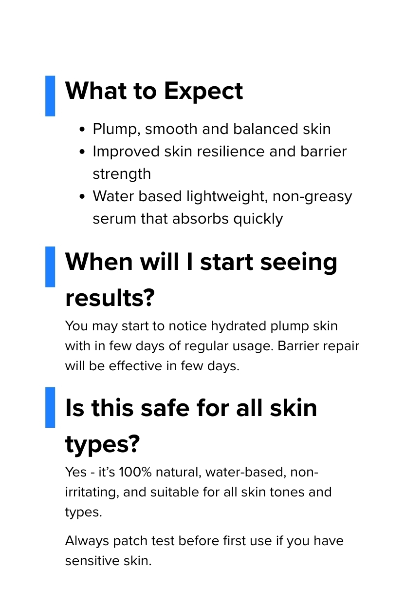 - Water based lightweight, non-greasy serum that absorbs quickly